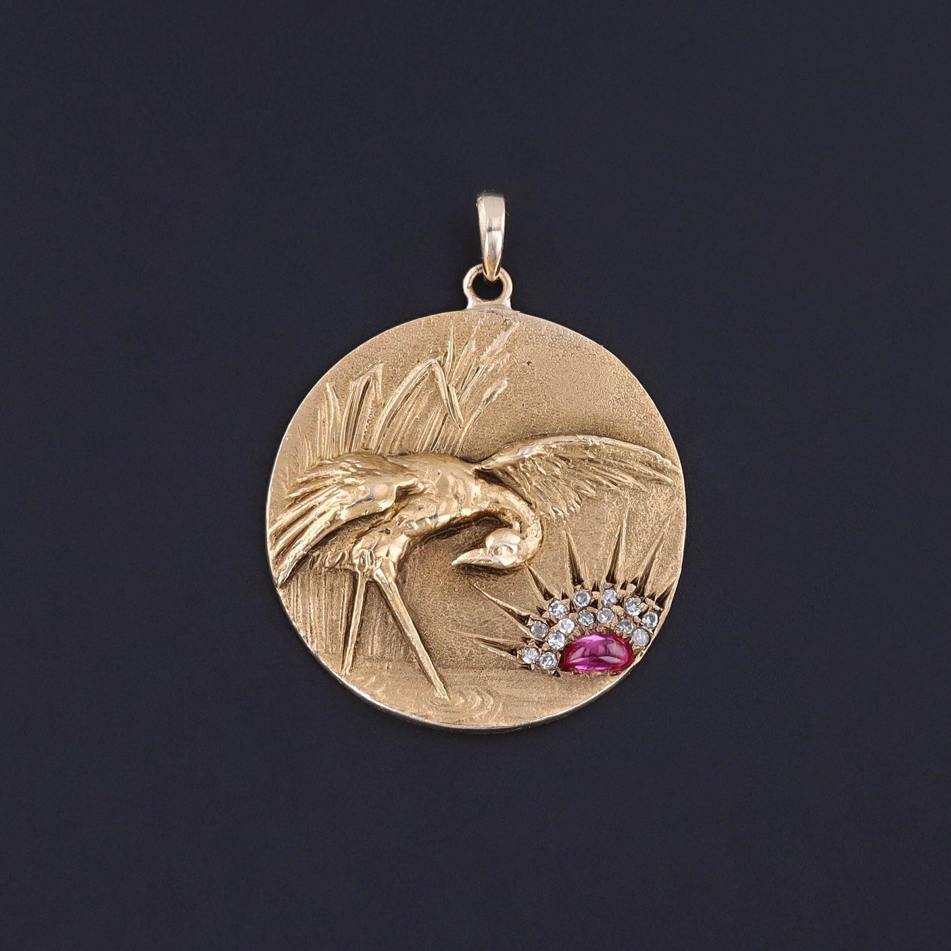 This outstanding pendant was converted from an antique cufflink (circa 1890) by removing the cufflink backing and adding a 14k bail. The 14k gold piece features a crane in a marsh with a ruby and diamond sun setting in the background.