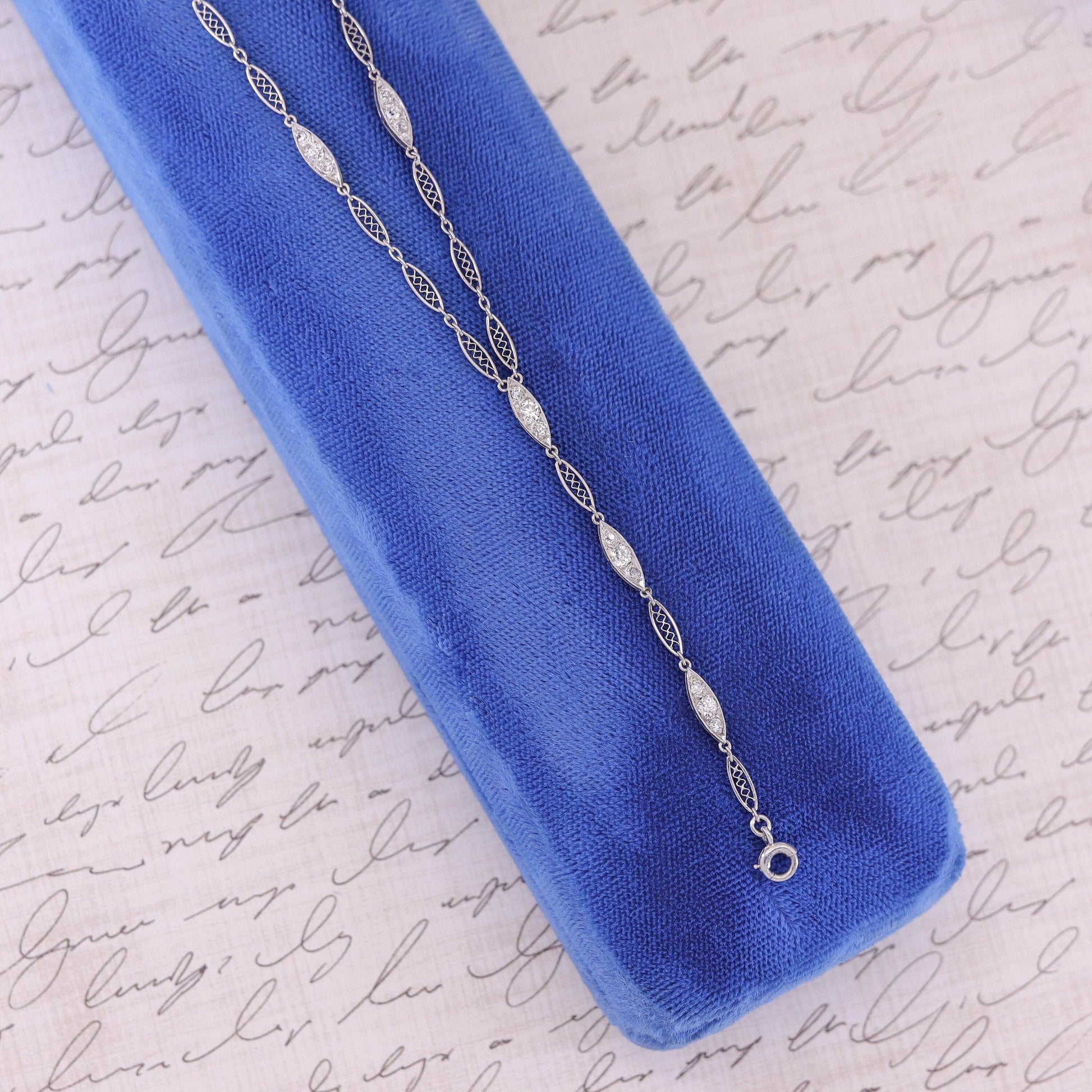 This necklace is beautifully rendered of fifty five platinum filigree links and seven diamond links (each with three diamonds). The diamonds are a mixture of old European cuts and old mine cuts.