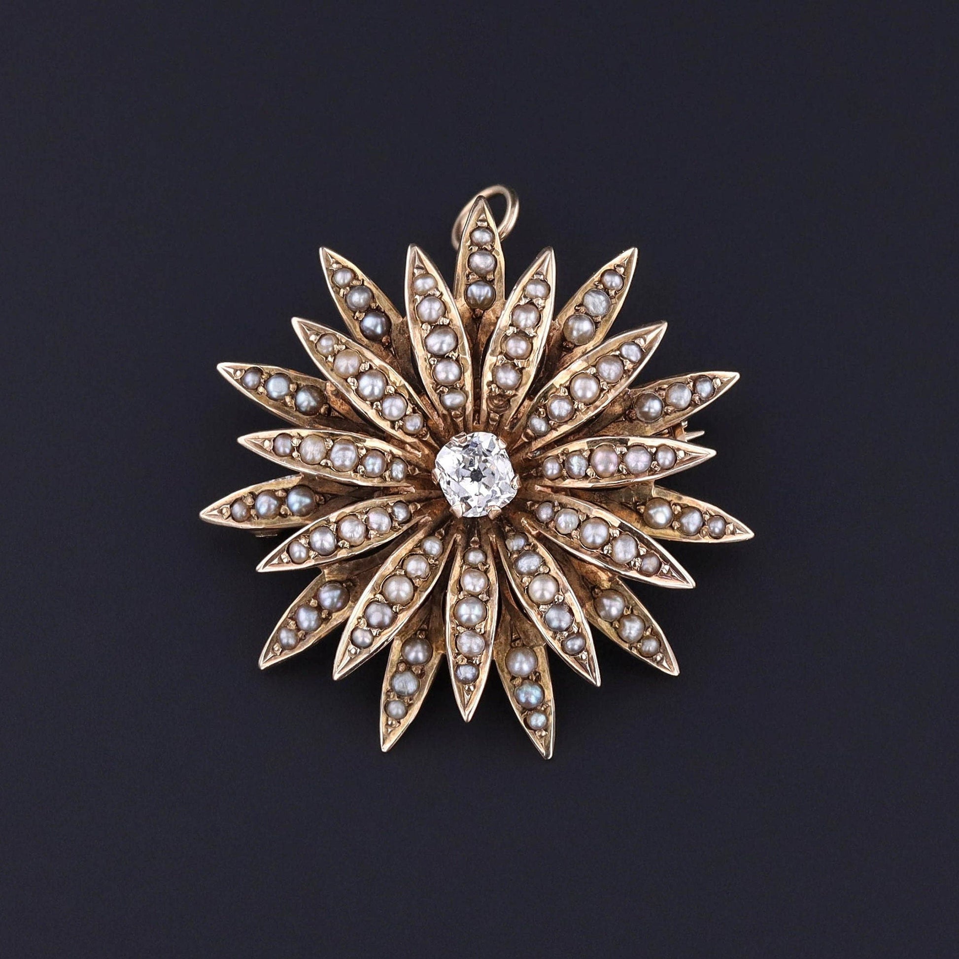 This antique brooch (circa 1890-1910) features a flower of 10k gold adorned with tiny half pearls and a glittery 0.37ct old mine cut diamond of H-I color, SI clarity. The brooch has a collapsible bail so it can be worn either as a brooch or pendant.