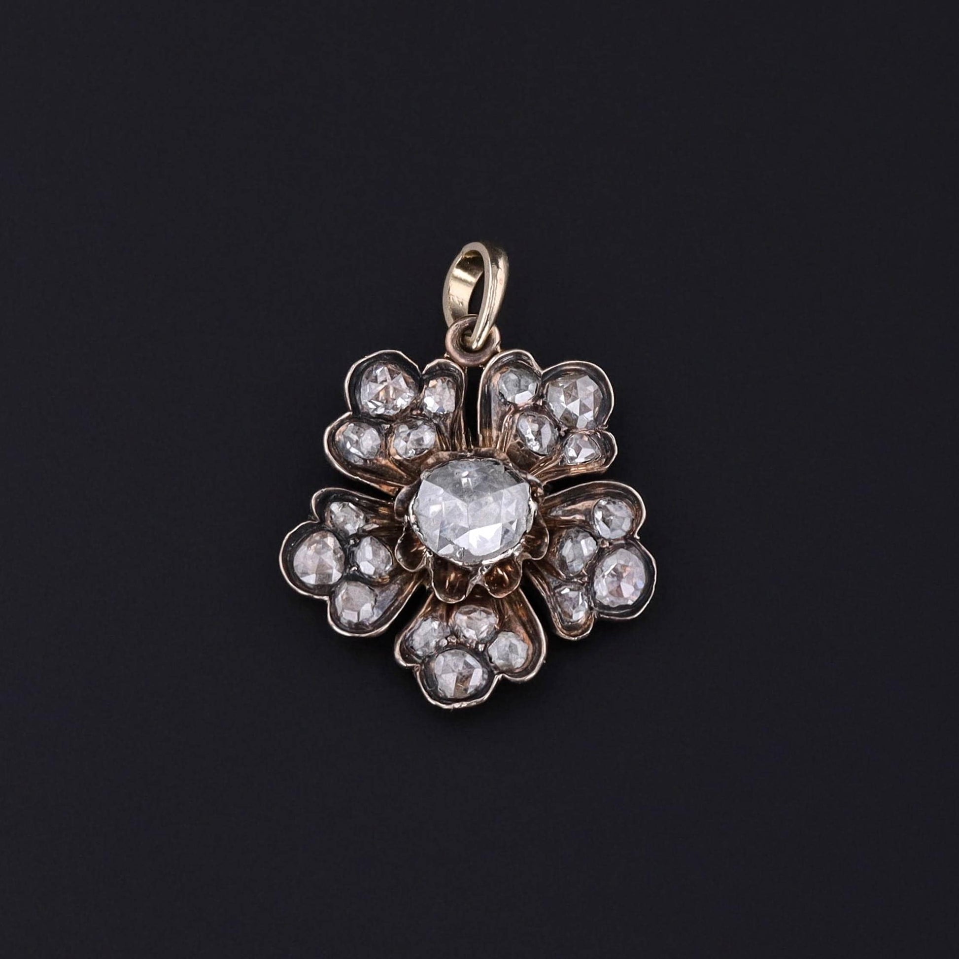 Antique Diamond Flower Charm: This antique pendant dates back to the mid Victorian era (circa 1850-1860) and features a flower of rose cut diamonds set in 9ct gold. The center diamond has a weight of 0.20ct.