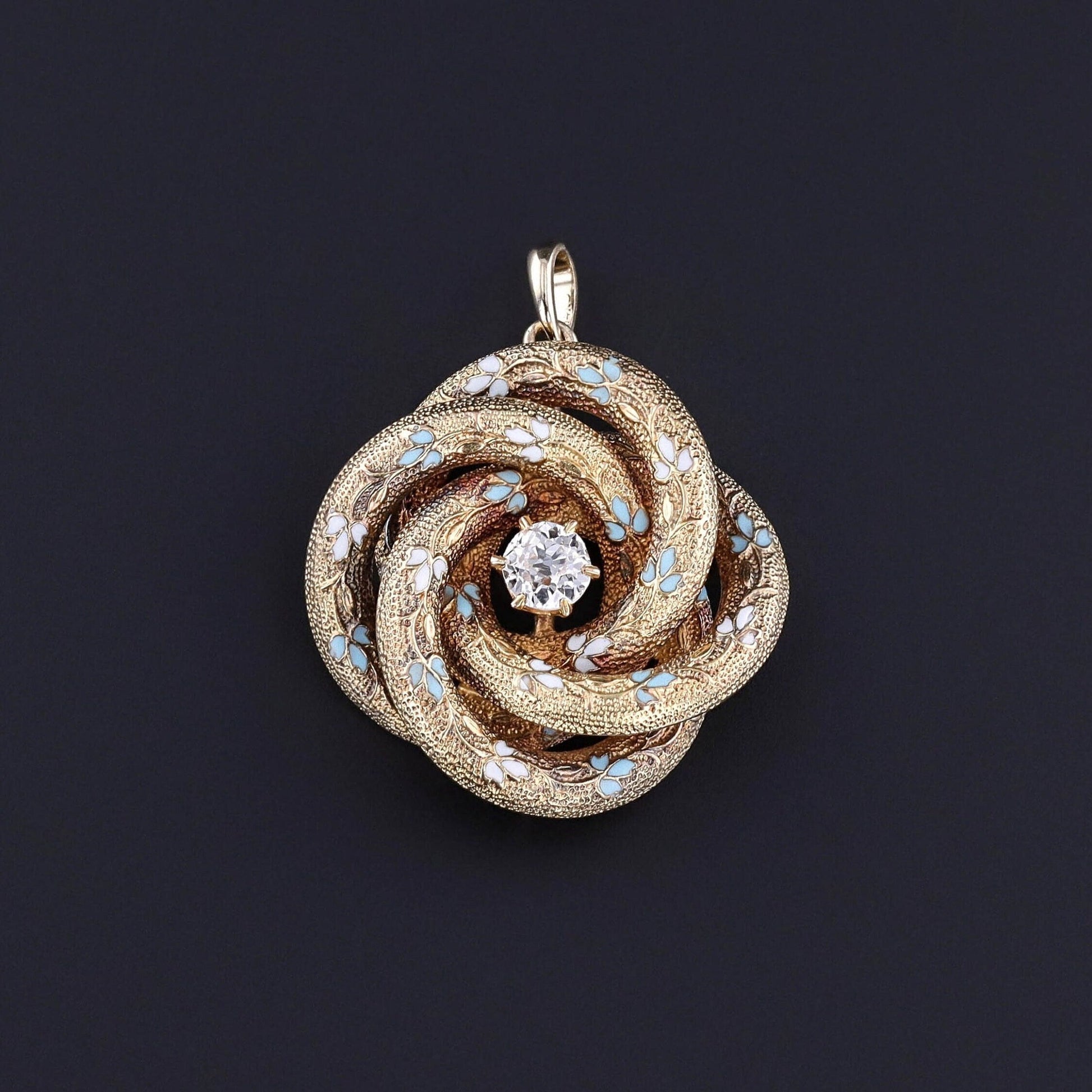 This 14k gold love knot was originally a brooch (circa 1890). It features blue and white enamel forget-me-not flowers and a 0.33ct old European cut diamond at its center. The diamond is I color, SI1 clarity.