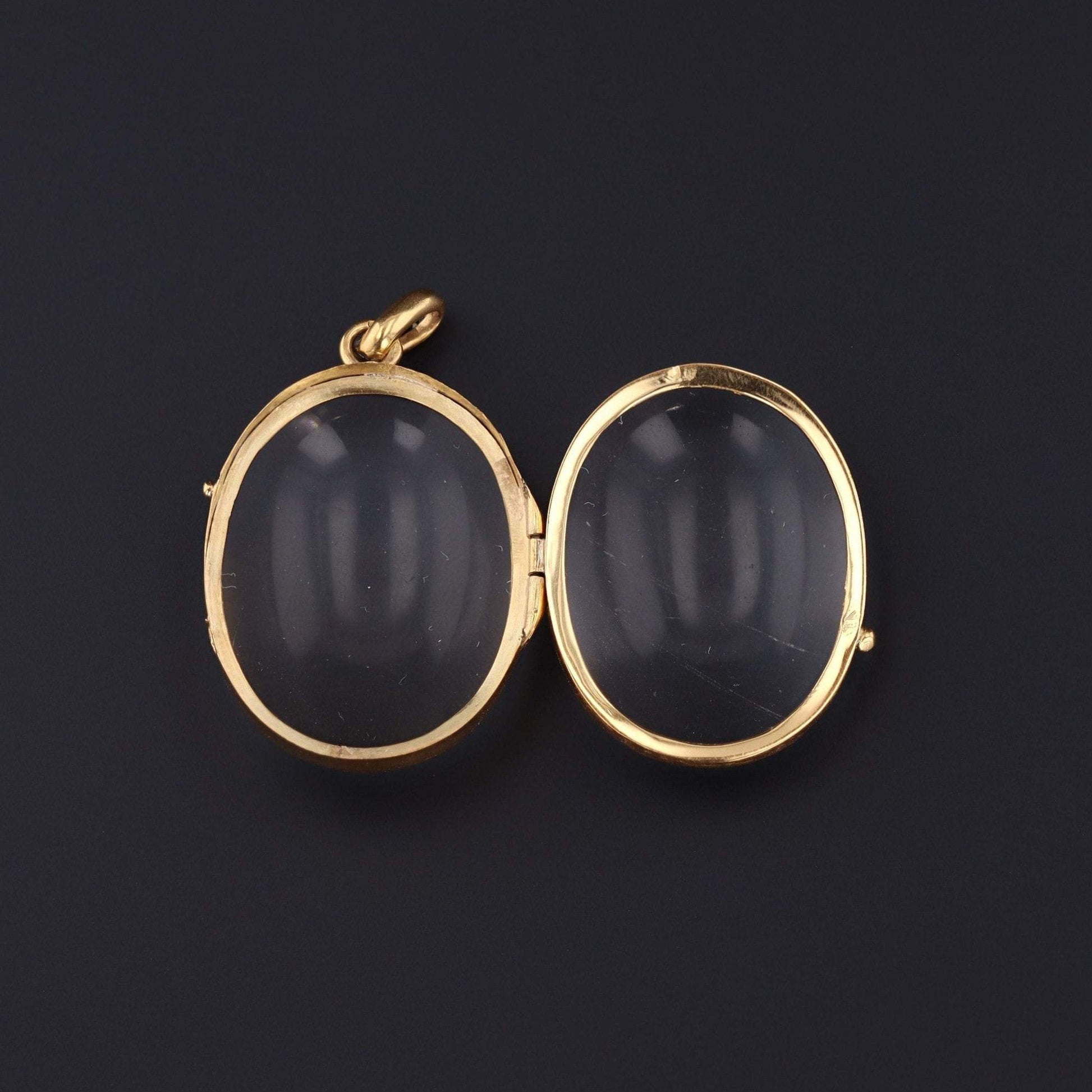 The stunning gold locket dates to the early 1900s. It is 14k gold and measures 1.2 inches from the top of the bail to the bottom of the piece by 0.8 inches wide.