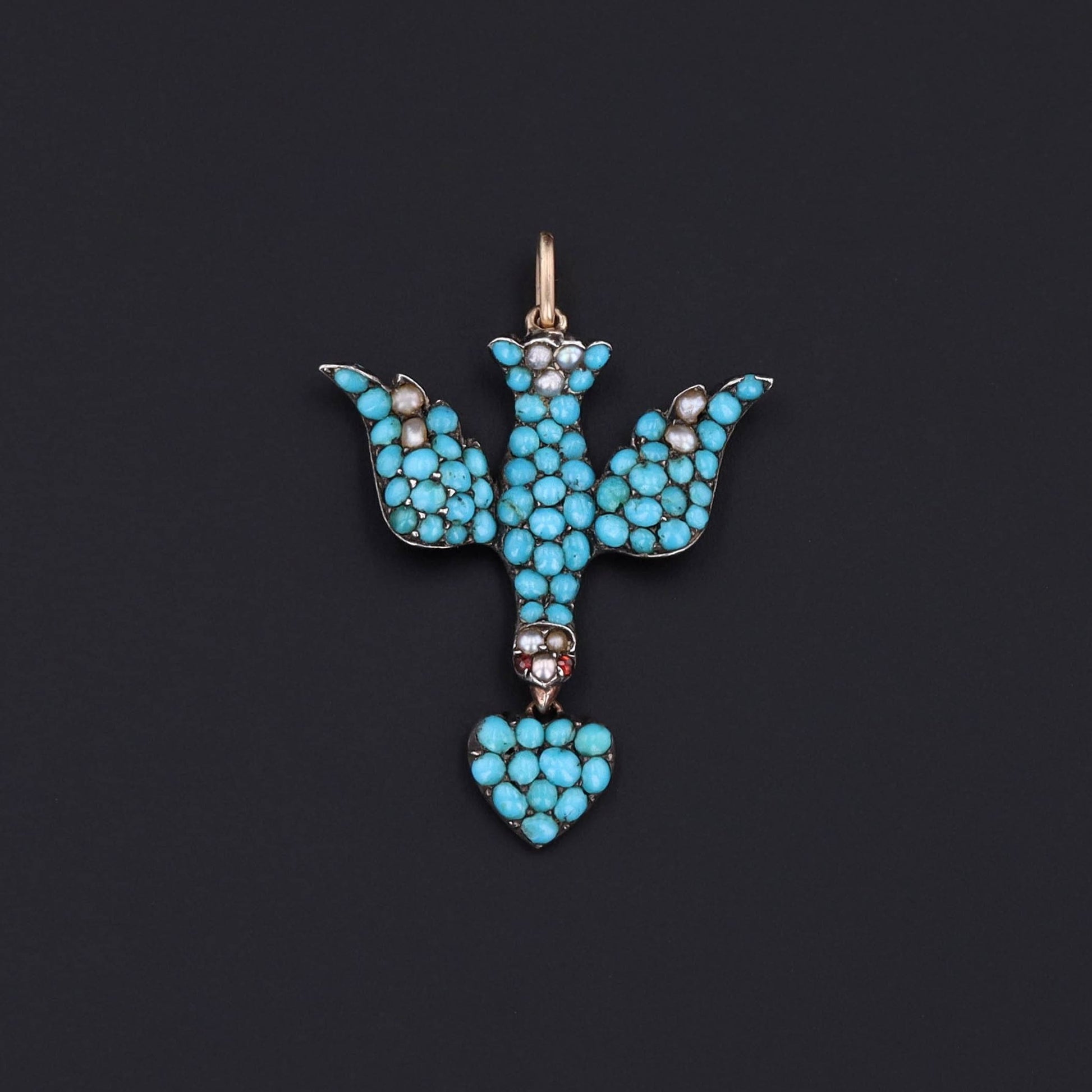 This Victorian era pendant (circa 1860-1880) features a dove adorned with turquoise and pearls, with a heart dangling from its beak. The pendant is silver, while the 14k gold bail is a later addition.