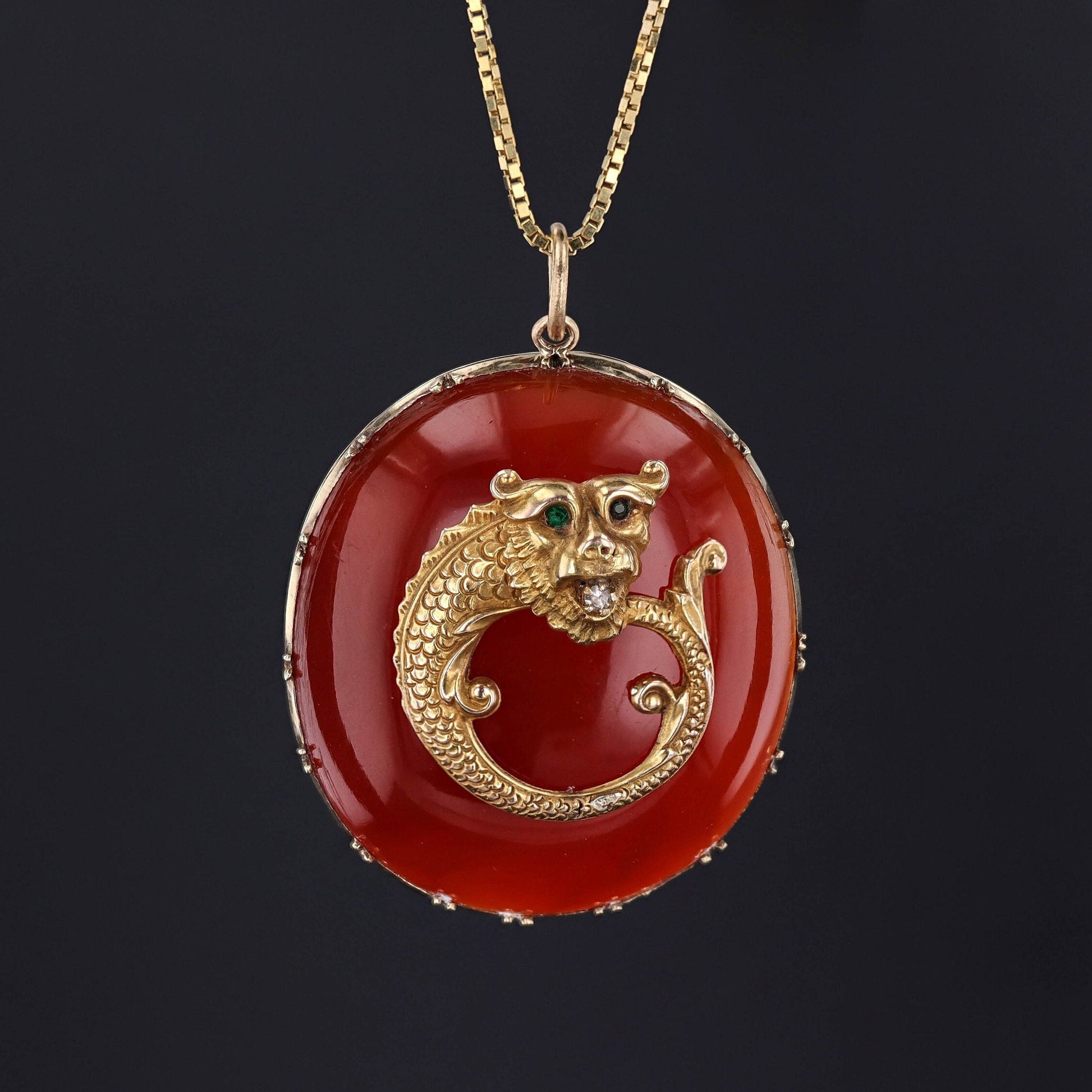 Antique Dragon Necklace | 14k Gold, Carnelian & Diamond