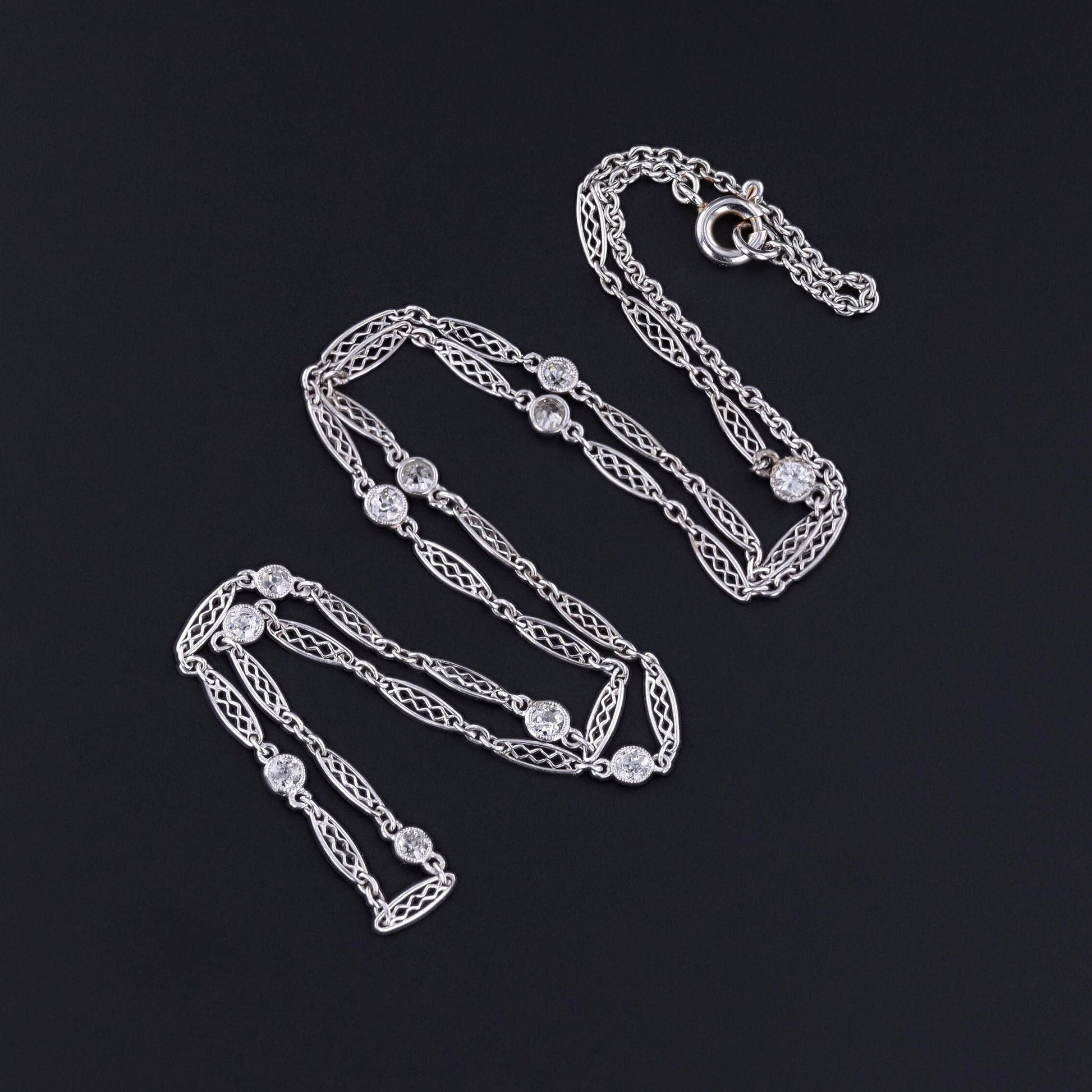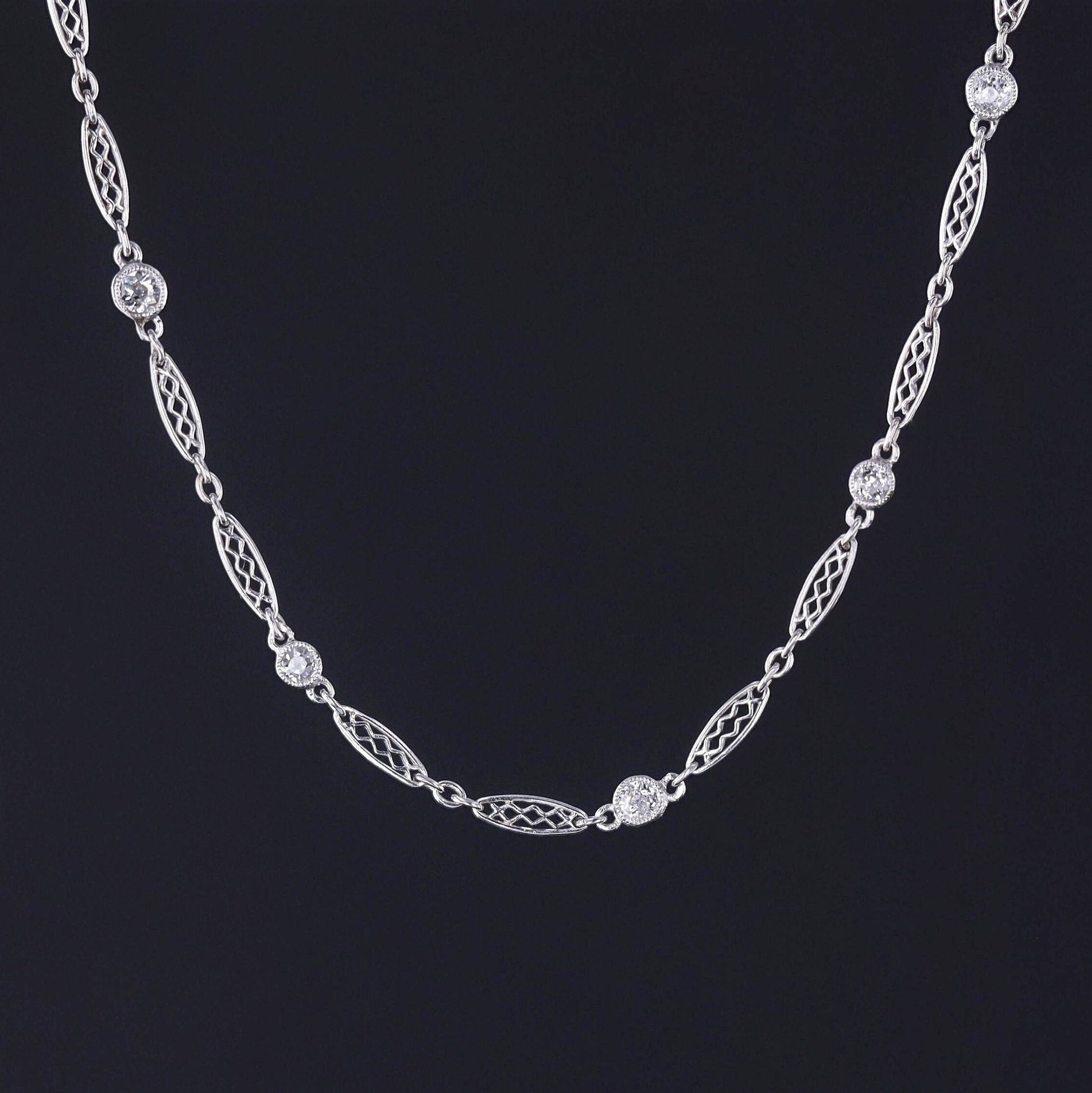 This antique, Edwardian chain (circa 1900-1910) features platinum filigree links interspersed with eleven old European cut diamond accents.