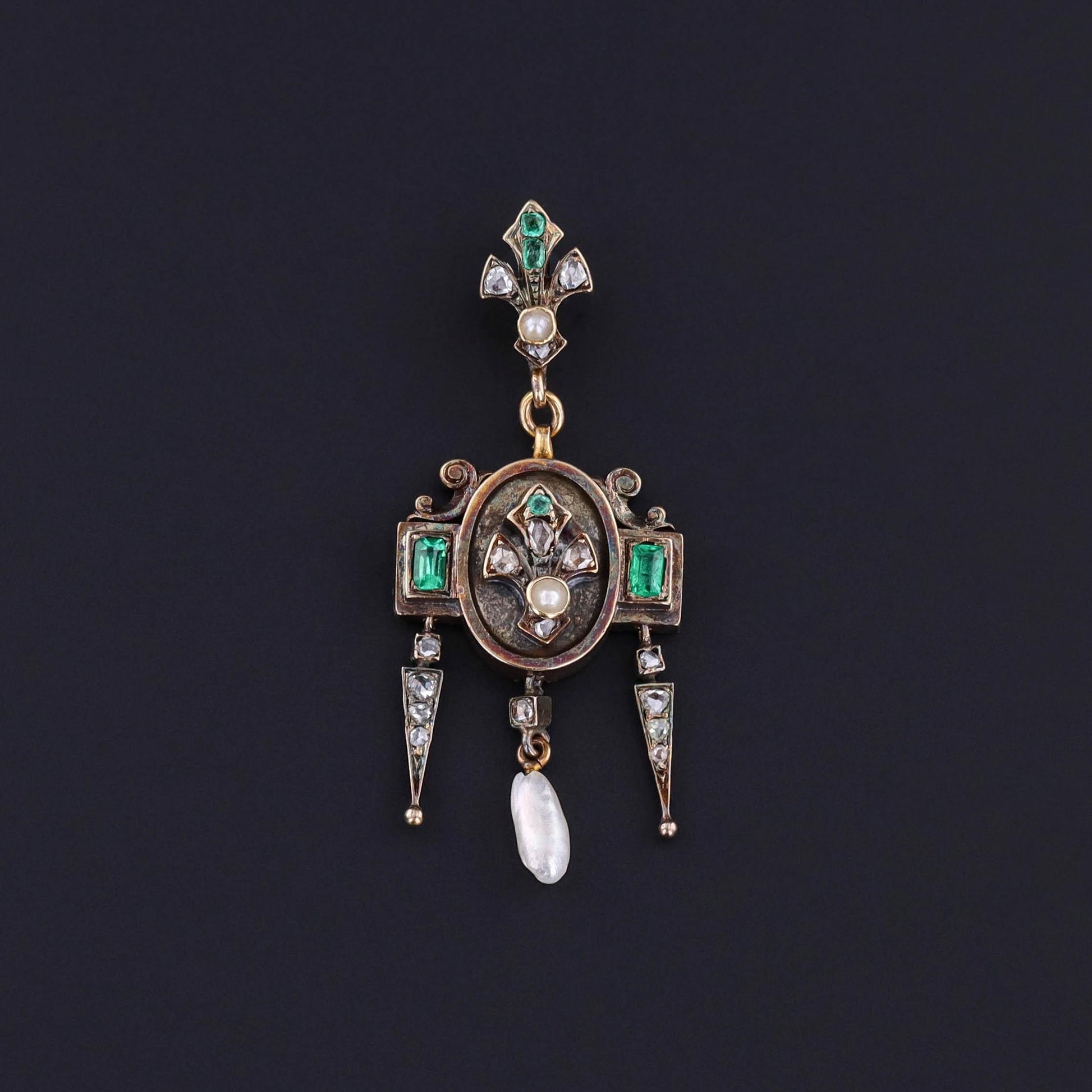 Antique Pendant: This antique, 18k gold pendant (circa 1860) features emeralds, diamonds, and pearls.
