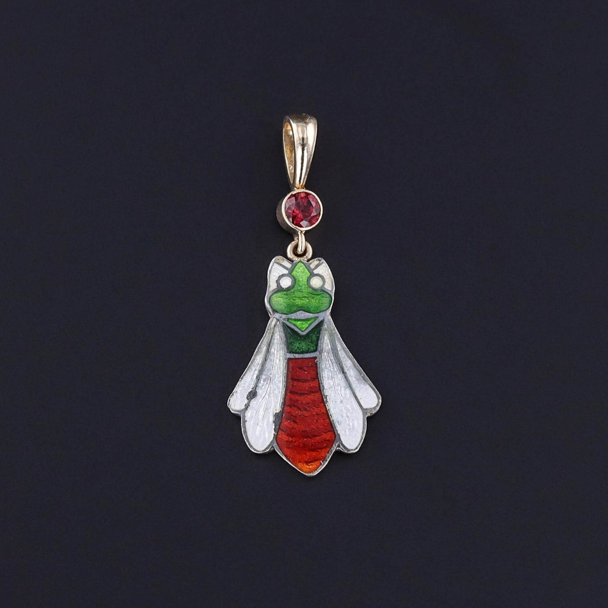 A dramatic pendant featuring an insect adorned with green, red, and white enamel. The enamel insect was originally part of a 1920s silver earring set. Our jeweler transformed it by adding a 14k gold back, 14k gold bail, and a garnet surmount.
