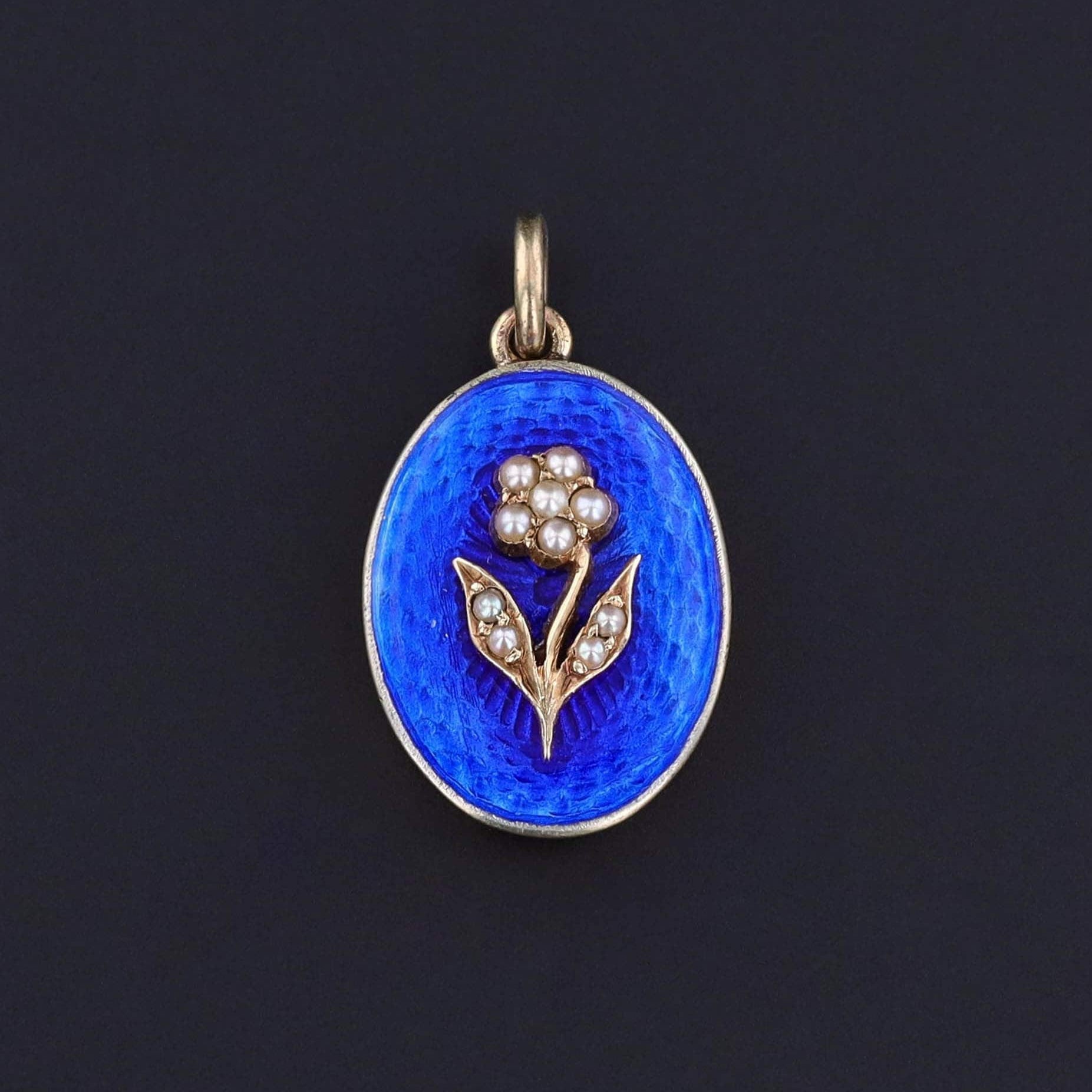 This Victorian era, 14k gold locket (circa 1840) features a pearl flower set atop a royal blue guilloche enamel backdrop. The back has a glass compartment to hold a photo, lock of hair, or small keepsake.