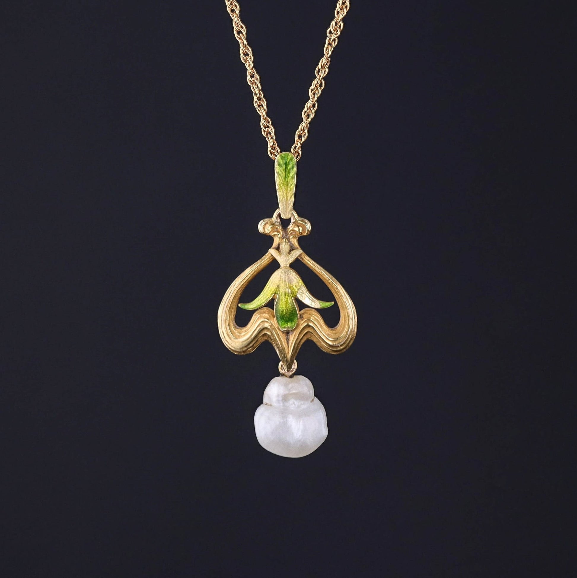 This antique pendant (circa 1910) features green enamel and a baroque pearl drop in 14k gold.
