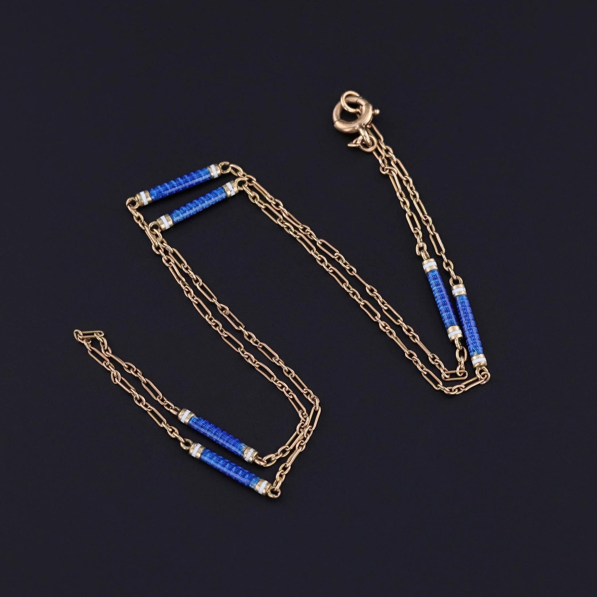 Antique Enamel Chain: This antique chain (circa 1910) features links of 14k gold and blue guilloche enamel.