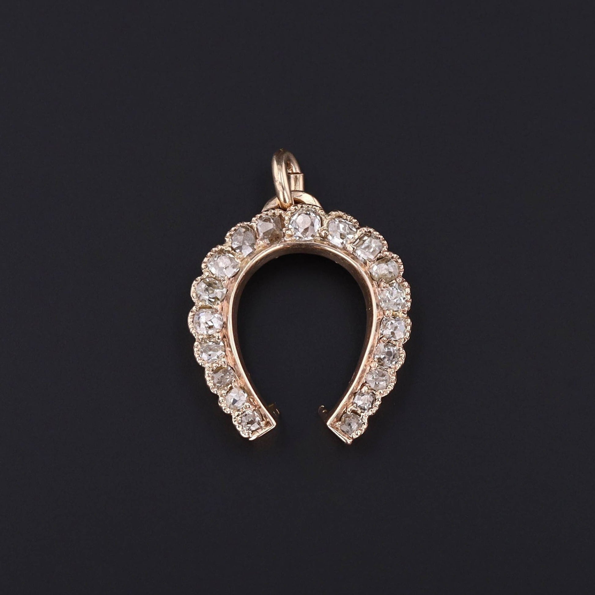 This antique pendant (circa 1900) features a horseshoe of 14k gold with chunky old mind cut diamonds.