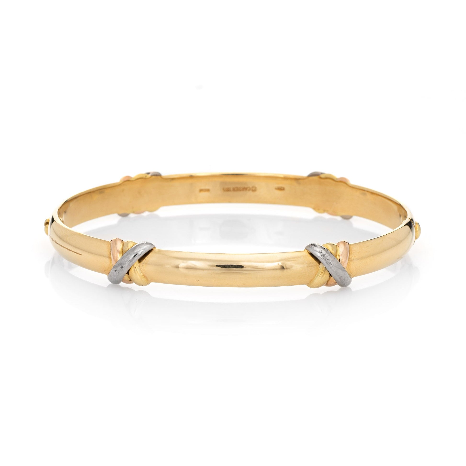 Overview:? Vintage Cartier Trinity bangle bracelet crafted in 18 karat yellow gold (with a rose, white and yellow gold trinity designed stations). Specifications: