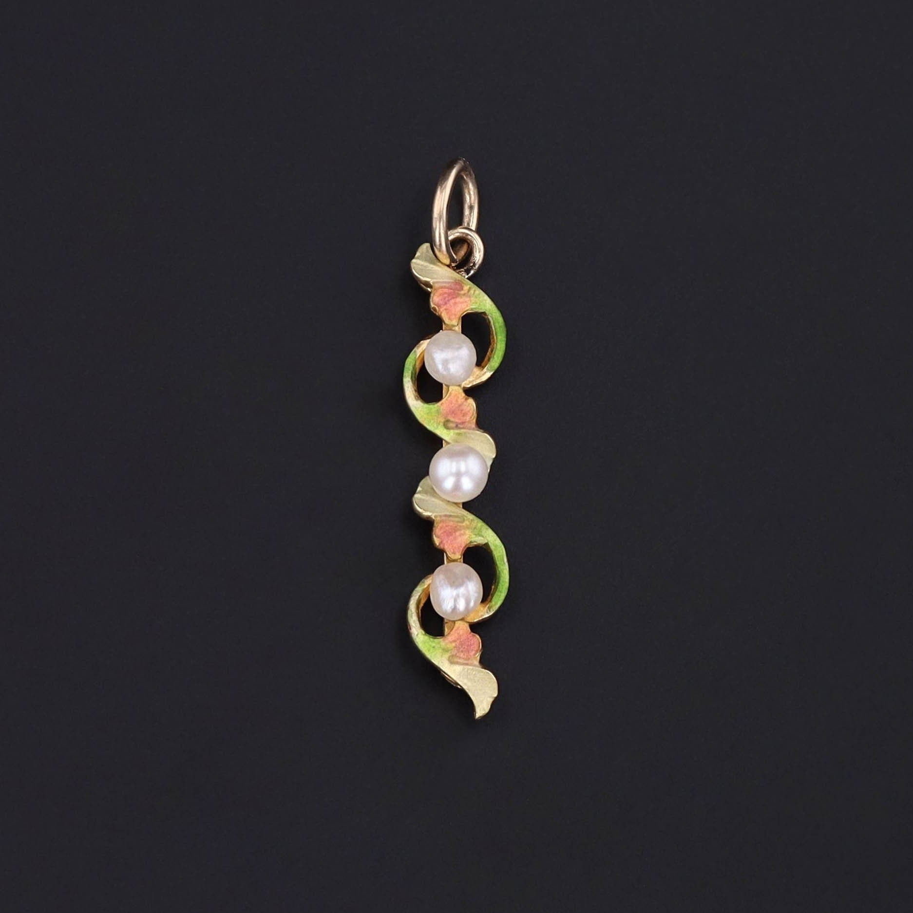 This 14k gold pendant was created from an antique pin (circa 1910). The piece is in great condition and adorned with pearls and lustrous pink and green enamel.
